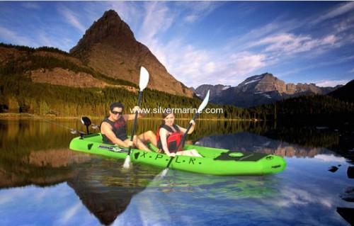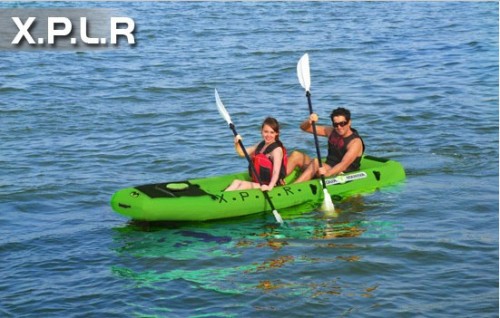 The X.P.L.R sit-on-top inflatable kayak offers air deck option for better loading capacity, the front bag design provides paddlers and fishmen enough space for gear storage. The new 2012 version also features additional fishing rod holders on both sides and optional rear facing seat designed for both rowing and fishing purposes while keeping the signature features of Aqua Marina series, including paddle niches, padded adjustable and removable seating, easy foot braces, and rubber carry handles.