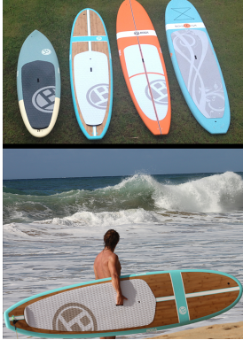 Our most popular Stand Up Paddle Board, the Classic has a smooth rocker line, a squash tail and 30" width for great stability. Price includes FUTURE fins and polished EVA diamond pad installed on bamboo and colored models. This board tracks great and has amazing glide in flat water making for a great all around board. The narrow tail makes this board super loose and fun in the surf also. We are happy to have hit the mark on shaping a true "Magic" all around board with both stability and awesome performance that grows with your paddling ability. As soon as you hop on this board you feel the stability of the 30" width and squash tail shape. After a few paddles you will be stoked on the boards glide and tracking capability, this board paddles straight and fast thanks to a 9" (FUTURE side fins included also) center fin and a double concave through the center. Ready for some surf? With hard sharp rails in the back section, vee in the tail, a thin 4 1/4" profile and the included FUTURE side fins this board rips in the surf.