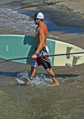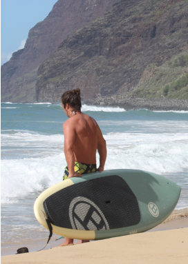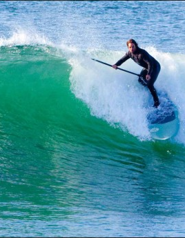 The wide nose and flattened rocker make it possible to catch waves early (important in fast, hollow surf), while the narrow tail and short overall length allow for shortboard-like adjustments in the pit. The combination adds up to a single board that works like two: pressure the nose for speed and stability, or weight the back foot for loose maneuverability. This board is extreme at 8.5 x 28 x 4 and can be run as a Quad or a Thruster. The results? This board absolutely rips, it feels like a short board when on a wave and due to its rocker line and wide forward point it is super easy to catch waves on. This board is recommend for experienced SUP Surfers looking for the edge. It also works great as a kids board since its small size is very easy to manage. Bamboo sandwich construction, weighs only 16lbs