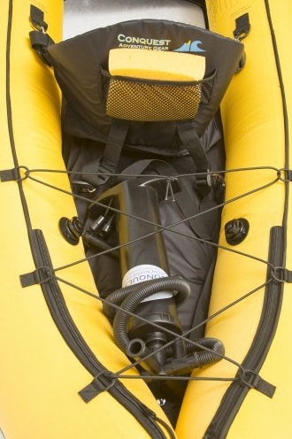 The Dyad also has 2 conveniently built in paddle ties on each side to secure your paddles. It inflates using a pump (sold separately); once inflated, the kayak measures 11' L x 38" W, supporting a maximum of 500 lbs. Also, folds and packs into full heavyweight nylon airport ready backpack with adjustable shoulder straps, cummerbund and mesh drain packet to promote ventilation. Heavy weight chamber "duel action" pump also included.