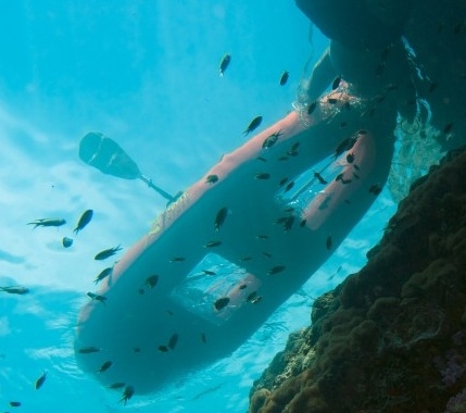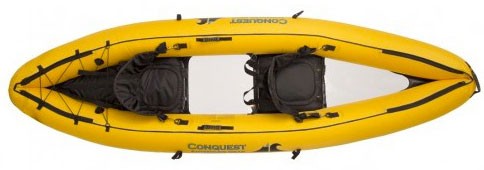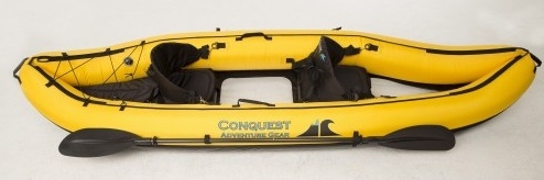 The Conquest Kayak is a two-person, clear-bottomed kayak that inflates in minutes for immediate still-water navigation. Its hull’s two sturdy 40-gauge PVC viewing panels allow you to view underwater features and sea life.