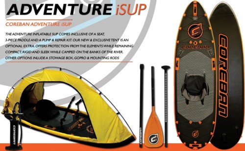 The adventure inflatable SUP comes inclusive of a seat, 3-piece paddle and a pump and repair kit. Our new and exclusive tent is an optional etra. Offers protection from the elements while remaining compact, rigid and sleek while camped on the banks of the river. Other options include a stowage bo, Gopro and Mounting Rods.