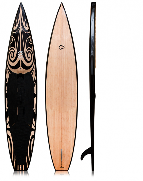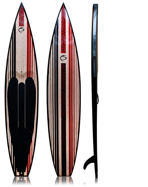 Ultimate high speed 12’ 6” class racing sup. One of the most stable and fast touring / racing SUPs available. Lighter and stronger with more innovative features than similar boards retailing at $2,300! 100% Bamboo Veneer on top and bottom provide lightweight, durable, and buoyant rigidity. This rigidity provides a more efficient energy transfer. The bamboo also allows the use of ultra-light weight EPS foam. 3 highly innovative features in the hull, displacement bow, flat speed front, and channeled mid-section give this board the very best combination of water slicing kick, quick planing speed, and stability. A recessed cockpit lowers your center of gravity, and minimizes water run on. Includes Creed SUPs innovative handle, and like all Creeds paddle boards has a Go Pro mount and auto- release Gor-valve.