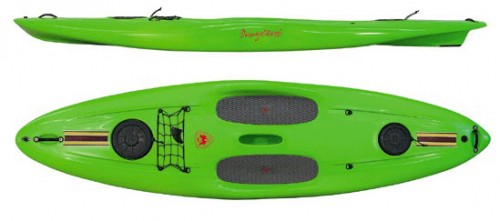 Then we’ve added a few extra little things. A deep foot area recess and sidewalls lower your center of gravity increasing stability, while at the same time giving you a “lip” for your feet to wedge against for extra control. A drop down rubberized skeg adds tracking in flatter sections, and end grab handles are added for ease and safety.