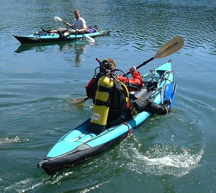 Self-bailing, drop skeg, travel bag, double-action hand pump, optional rudder or second-seat kit