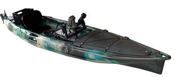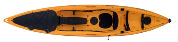From hull form to deck layaout and steering system, you'll find thoughtful details everywhere. It sports a bow gear locker with a two-way hinged hatch cover and two cockpit hatches. There's room aft for a storage crate, live bait bucket or scuba tank. Within reach of the paddler are a handy flip-up console for lures and gear, and a center mounting area for additional fishing rod holders, GPS and electronic fish finder. Further innovations you'll appreciate are the flip-top rudder pedal steering system and the molded in handles on the bow and sides.