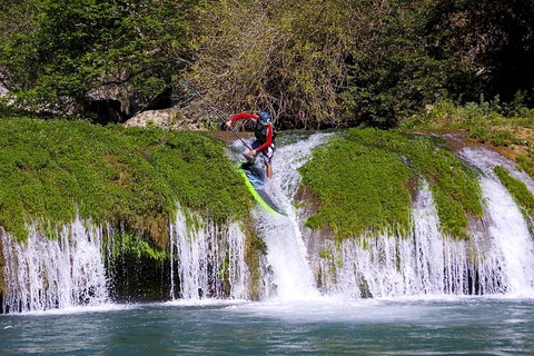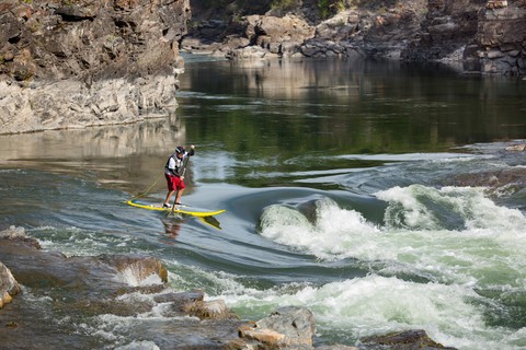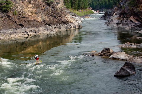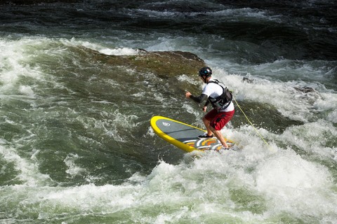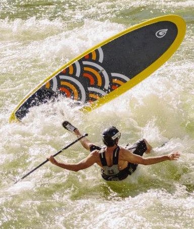 The Mongo has kick rocker in the nose, single concave, and then a deep vee in the tail. The paddleboard is fast on a wave, and easy to initiate rail to rail turns. If you are looking for a board primarily used to surf river waves, but still want to be able to run the river, this is your board.