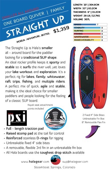 The Straight Up is Hala’s smaller all – around board for the paddler looking for a traditional SUP shape. An ideal rocker profile keeps it sporty and stable so it surfs the river well, yet loves your lake workout and exploration. This family stand up paddle board is perfect rig for lakes, whitewater, raft trips, fishing, and multiple riders. A perfect mix of quick, agile and stable, making it the ideal choice for smaller paddlers and people looking for the feeling of a classic SUP board.