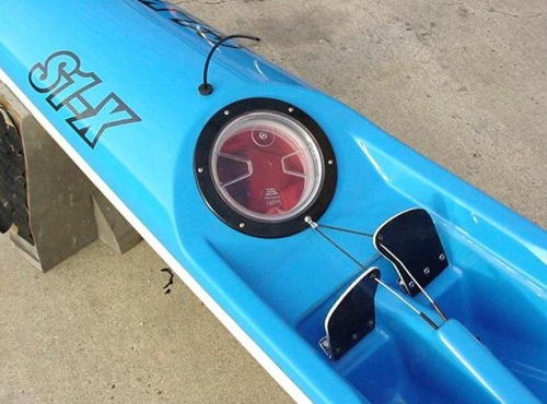 On the S1-X, you can wear most sandals & booties, and we can install self bailing foot well drains. We can install bungees on the fore deck and aft deck, in the cockpit or where ever you want them, and can place stow hatches at both ends of the cockpit as well as under your knees where you can place your water system or other items on the keel for easy access while paddling and for maximum stability. She has the HUKI adjustable response rudder system and can be rigged with a kelp guard and a variety of several rudders. We can install a variety of custom items like; anchor blocks for things like foot straps, handles and hook loops, a sealed hole through the footwell divider for locking the surf ski, eye holes at bow and stern, etc.