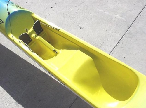 Her foot well system is unique. We offer single or individual foot-wells and can attach the steering cables to the pedals from the foot-well divider or from the gunwales, it's up to you. Our single foot well can save some weight in construction materials and will place the feet and knees close together for those people who're used to a tight body position. We have an adjustable foot well system so that people of different heights can use the same boat. We have a couple other foot-wells developed to fill the needs of customers with even greater custom requests. Each of our foot well systems places the heels of the feet directly on the bottom of the hull for maximum comfort and stability.