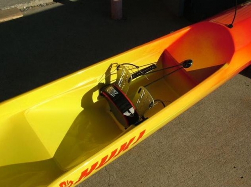 I redesigned the crown of the foredeck to part and shed water much faster and raised the stem of the bow so it's more difficult for water to reach the deck or stay on it. I raised and beveled the gunwales so that the paddler's fist and blade will fit closer to the hull at the catch and carved out a bevel in the side of the deck combing just in front of the cockpit to narrow the entire catch zone, so you can now slice the blade in even closer than the original X to get a greater extension and longer pull. I left the sides of the seat low for easy remount and widened the rim of our standard seat to accept a wide range of hip sizes and made a longer cockpit to fit taller paddlers. I moved the whole cockpit forward just slightly to reduce slamming during upwind climbs and to goose the nose down early during the downwind run, this also reduced broaching to a level even less than the original X which was already famous for maneuverability and control. I designed a new footwell that allows the knees to drop lower without the calves bottoming out and we still have original full line of the footwells that include double well adjustable, fixed size single well and fixed size double wells. I moved the rudder position even farther forward to match the new cockpit position to insure grip when other surf skis loose rudder contact with water. I refined the hull shape in very slight ways to improve the planing surface and glide and to improve it's ability to carve. I designed three new rudders for the S1-X Special that run along new concepts in minimizing surface area, core thickness and drag while increasing response. I increased the volume and beam of the aft section from the back of the cockpit to the pin-tail transom without increasing the beam at the waterline or overall beam of the boat. I designed a single foot well with a totally new adjustable track system for Huki that is very similar to the common systems you have seen on the race course, and I designed a foam space filler for this new foot well to take up the unused space and keeping the bath tub effect lower than any other adjustable foot well out there.