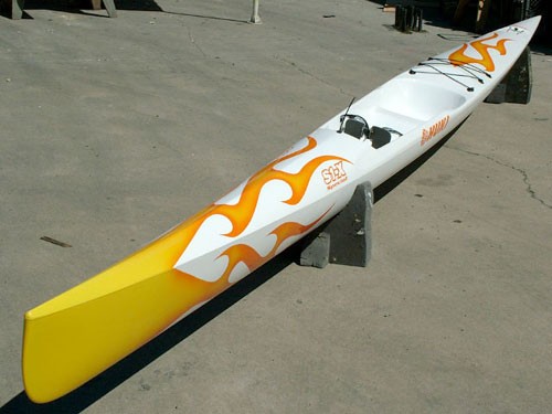I redesigned the crown of the foredeck to part and shed water much faster and raised the stem of the bow so it's more difficult for water to reach the deck or stay on it. I raised and beveled the gunwales so that the paddler's fist and blade will fit closer to the hull at the catch and carved out a bevel in the side of the deck combing just in front of the cockpit to narrow the entire catch zone, so you can now slice the blade in even closer than the original X to get a greater extension and longer pull. I left the sides of the seat low for easy remount and widened the rim of our standard seat to accept a wide range of hip sizes and made a longer cockpit to fit taller paddlers. I moved the whole cockpit forward just slightly to reduce slamming during upwind climbs and to goose the nose down early during the downwind run, this also reduced broaching to a level even less than the original X which was already famous for maneuverability and control. I designed a new footwell that allows the knees to drop lower without the calves bottoming out and we still have original full line of the footwells that include double well adjustable, fixed size single well and fixed size double wells. I moved the rudder position even farther forward to match the new cockpit position to insure grip when other surf skis loose rudder contact with water. I refined the hull shape in very slight ways to improve the planing surface and glide and to improve it's ability to carve. I designed three new rudders for the S1-X Special that run along new concepts in minimizing surface area, core thickness and drag while increasing response. I increased the volume and beam of the aft section from the back of the cockpit to the pin-tail transom without increasing the beam at the waterline or overall beam of the boat. I designed a single foot well with a totally new adjustable track system for Huki that is very similar to the common systems you have seen on the race course, and I designed a foam space filler for this new foot well to take up the unused space and keeping the bath tub effect lower than any other adjustable foot well out there.