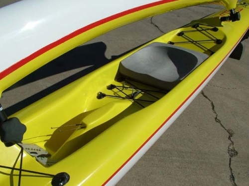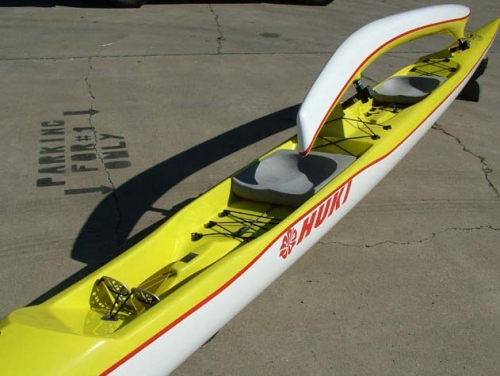 We can build her in non-vac'd Fiberglass as light as 45 pounds fully rigged, or we can build her in Vac'd Carbon/Kevlar in as little as 36 pounds fuly rigged. We use foam core in all our Vacuum Molded OC-2 (two person Outrigger Canoes) and we also have several other constructions available for a variety of combinations of durability, money savings and all out racing. We can outfit her with the widest variety of options found nowhere else in the world on Outrigger Canoes. She can be outfitted with Dual Steering positions (pedals in front and pedals in back) or just one set of steering pedals where ever you want them. We can install bungees behind each seat for bulky gear, in front of each seat for water and nutrition systems, in front of each cockpit for more storage. We can place three sizes of hatches in front of the front cockpit steering pedals and/or three sizes of hatches behind the rear seat. We can reinforce the outer seam and anywhere else you request. We have about a dozen different rudders available, each one changeing the performance all together and aiming its peak performance towards any particular water condition. She comes with our Stubby Transport Iako Set for rigging the ama above the cockpit so you can more easily cartop and store her. Available with sliding track foam seats, or velcro down standard seats, or custom fitted seats that fill the whole seat platform.