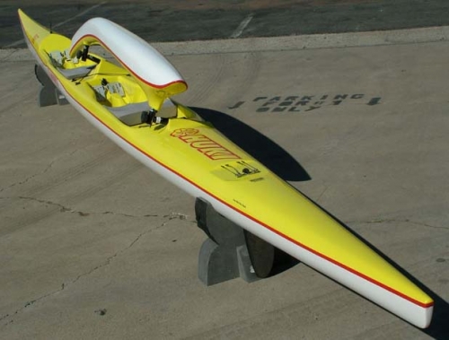 Developed & designed by Jude Turczynski and Wayne Kocher in the Spring of 2009, V2-X is a high volume all conditions two person canoe that out runs the V2-Z on the flats and has enough volume for a variety of paddlers and conditions. Wayne Kocher shaped her from a V2-Z, moderating the rocker and boosting volume at all critical points by increasing the beam (width) by one inch and raising the gunwales along the cockpits and aft deck. Wayne placed a pair of low set cockpits with high supportive side walls like those found in the newly redesigned 2009 V1-X that he shaped earlier this year. The lower rear cockpit allows a lot more clearance for the rear paddler to reach under the front iako. Wayne placed a water parting ridge along the entire fordeck so pearling is limited to short events.