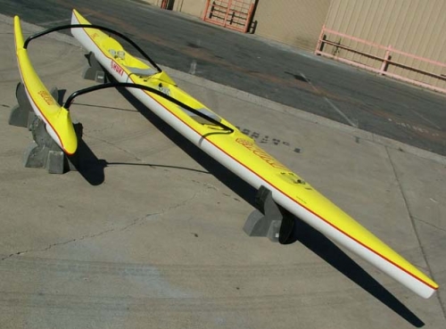 We can build her in non-vac'd Fiberglass as light as 45 pounds fully rigged, or we can build her in Vac'd Carbon/Kevlar in as little as 36 pounds fuly rigged. We use foam core in all our Vacuum Molded OC-2 (two person Outrigger Canoes) and we also have several other constructions available for a variety of combinations of durability, money savings and all out racing. We can outfit her with the widest variety of options found nowhere else in the world on Outrigger Canoes. She can be outfitted with Dual Steering positions (pedals in front and pedals in back) or just one set of steering pedals where ever you want them. We can install bungees behind each seat for bulky gear, in front of each seat for water and nutrition systems, in front of each cockpit for more storage. We can place three sizes of hatches in front of the front cockpit steering pedals and/or three sizes of hatches behind the rear seat. We can reinforce the outer seam and anywhere else you request. We have about a dozen different rudders available, each one changeing the performance all together and aiming its peak performance towards any particular water condition. She comes with our Stubby Transport Iako Set for rigging the ama above the cockpit so you can more easily cartop and store her. Available with sliding track foam seats, or velcro down standard seats, or custom fitted seats that fill the whole seat platform.