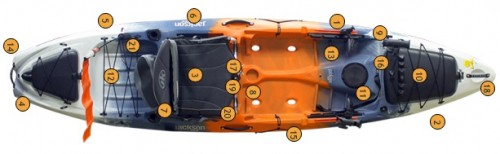 Open hull space that allows for safe storage of fishing rods, camping gear, PFD’s, dry bags, etc.. A great way to keep your gear safe when traveling and generous volume allows you to pack enough gear for expedition paddling.