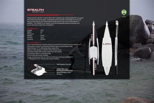 Purely bred for speed! A carbon fiber skin wrapped over a lightweight EPS core gives this board the winning edge. Developed using scientific knowledge from the sail boat racing industry and comfortably stable even for the most intermediate of paddlers. The Stealth is our fastest, most technologically advanced design and is your best bet to beat the competition.