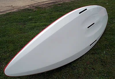 New for 2005 is totally revised outfitting including new a seat which has lowered the centre of gravity and also gives a much more positive and comfortable setup, combined with a lycra covered butt pad, adjustable thigh braces and footblocks. The Fin boxes have also been modified to accomodate our new anodised aluminium box.