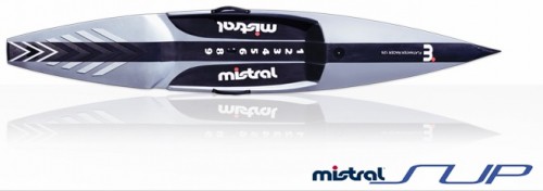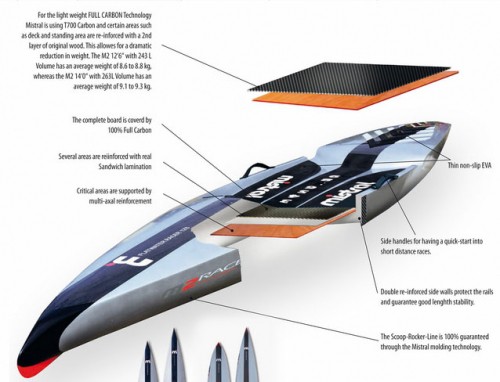 The M2 full carbon race board is one of the lightest, fastest on the market, for pro-riders and experts, with an average board weight of 8.6kg (12’6”) and 9.3 kg (14’0). Designed with flat-water and speed in mind, the conic hull shape brings in a great blend of acceleration and effortless gliding. Mistral has fused the positive gliding characteristics of a racing kayak with those of a surfboard.
