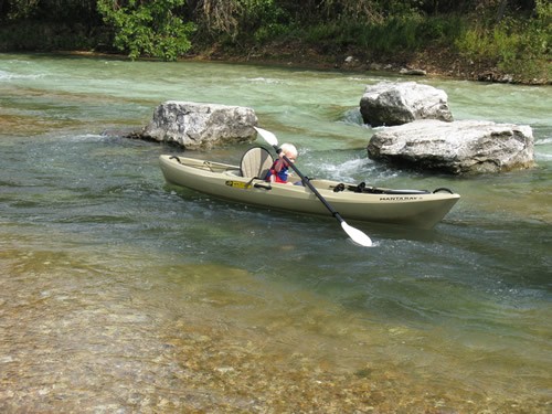 The shortest of the Manta Rays, the 11 is a good choice for those who vary their routine between moving and flat water. In moving water, the 11 turns nimbly, and if you take on a little splash, the water runs right through the meshed DVC Seating (Drains, Vents Cushions), the gold standard in sit-on-top seats. Other comfort features include Easy Foot rests and padded carry handles that pamper your fingers and toes, and a Tag Along Wheel. Secure dry bags and fishing crates in the recessed cargo area aft; dry storage up front. Performance Promise - Stable ride - Sit-on-top convenience — easy on/off - Comfortable support for rear end and lower back - Seat self-drains and vents - Boat self-bails - Ideal for flat water and rivers Features