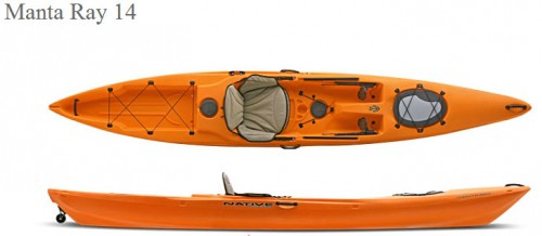 Got some water to cover? The Manta Ray 14 is the fastest in the family. It's also the payload master with lots of dry storage up front, and a generous, recessed deck in the back, plus two day hatches within easy reach. Deluxe DVC (Drains, Vents, Cushions) is the best sit-on-top seat, drier and cushier than anything you've tried before, we're certain. Whether you're pulling an overnighter or fishing all day, this is the sit-on-top kayak for you. Performance Promise - Fast, with a stable ride - Sit-on-top convenience — easy on/off - Comfortable support for rear end and lower back - Seat self-drains and vents - Boat self-bails - Ideal for flat water and rivers