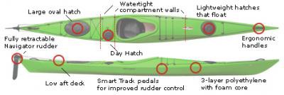 The Crunch is fully equipped with day hatch as well as bow and aft compartments. The recessed deck fittings accommodate a very clean deck rigging system with full perimeter deck lines and ergonomically designed carrying handles. It is available with the excellent retractable Navigator rudder from KajakSport and Smart Track rudder control system that allows for comfortable support, as well as strong steering efficiency.