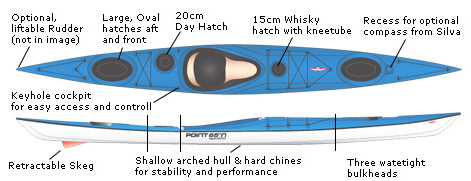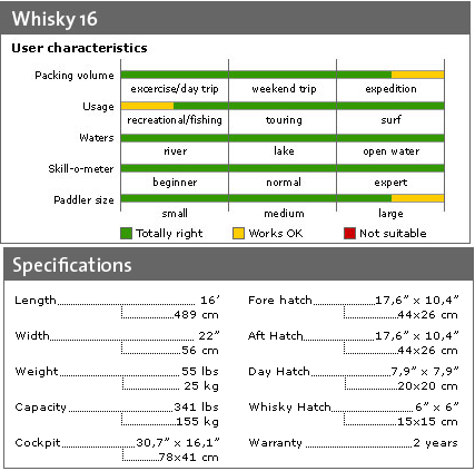 The padded cockpit comes fitted with an ergonomically designed seat which provides excellent support as well as providing the close contact needed when rough-water playing, and a highly functional back support that offers great comfort and lumbar support. The compass recess on the fore-deck accommodates a Silva 70P compass which is optional. The Whisky 16 is standard fitted with a retractable skeg and footrests. It is also available with an optional rudder control system.