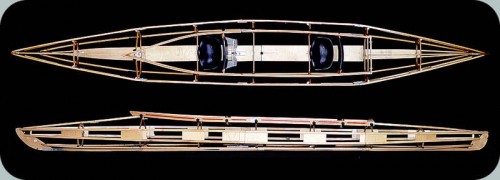 This folding kayak is a new model, produced by us. It is a safe boat with high stability, even under difficult sea conditions as well as on rivers and lakes. On the sides under the skin run sponsons to increase the all - over stability of the craft. The skin is made of impregnated cotton fabric of abrasion resistant quality with high "breatheability" that ensures comfortable air circulation inside the boat (especially when using a spray deck). The skin is made of cotton fabric with either rubber or plastic coating. This treatment prevents degradation resulting from exposure to ultra violet radiation, salt water and low temperatures. Air tubes running along the entire length inside of the boat. are called air sponsons. These tubes, encased in the soft sides, provide unbelievable stability. The steeply pitched deck and washboards keep the cockpit dry even in wind and waves. A canvas detail strip in the deck-hull-seam expands when wet and completely seals the seam. The longitudinal members of the frame are made of high - quality ash, for its resilience and flexibility. Transverse members (ribs, gunwale) are made of many -layered plywood, for its ability to withstand shock loads. Moreover, the new graded steel fittings guarantee a faster and easier assembly. Due to these improvements the dimensions of the packed boat have been reduced to 1.55 metres (about 5.1 foot).