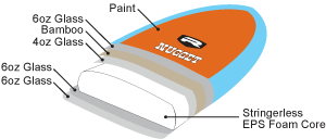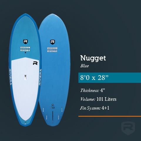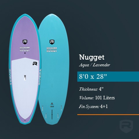 The 8' Riviera NUGGET is an agile board for kids and a great high performance SUP surfboard for adults. This SUP is 28" wide, and easy to ride for kids. Just the right amount of rocker with slightly pulled in nose, diamond tail for added drive and vee bottom out the tail make this board surf great. We have had advanced SUP Surfers up to 220 Surf this board! The NUGGET comes with a Futures Fins Five fin set-up (4 + 1) to adjust to paddling and surfing conditions. Riviera traction is pre-installed.