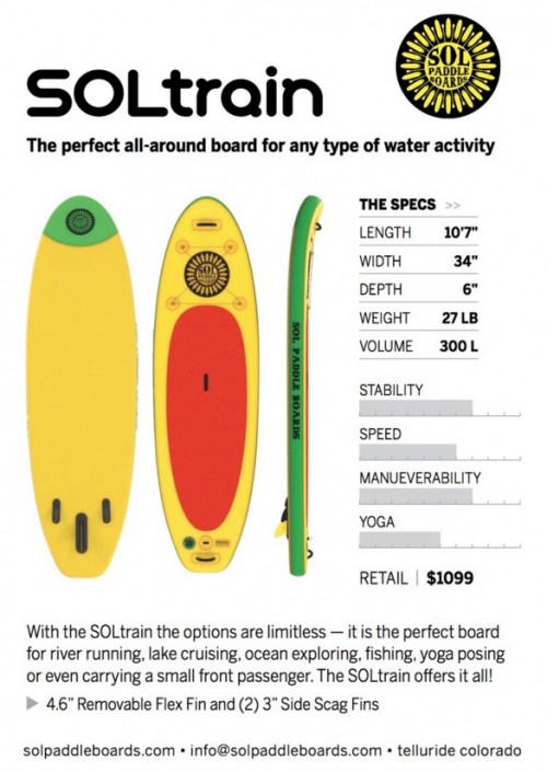 The SOLtrain is the staple of SOL! At 10'7" and 33.5" it handles a 300lb payload and still maneuvers on a dime! This board is the perfect all around board for any type of water activity. River running, lake cruising, ocean exploring, yoga posing to hanging with your furry friend, this board offers it all! Holding up to 15 psi of air, these boards pump up rock hard for maximum rigidity and stiffness.