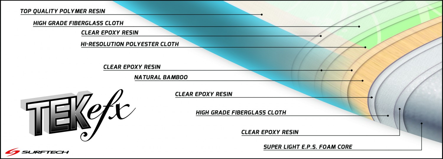 TEKefx boards feature our proprietary fused-cell core, compression molded using high quality bamboo veneer and fiberglass. The TEKefx graphics are laminated in the board creating a vibrant, scratch resistant, long lasting graphic.