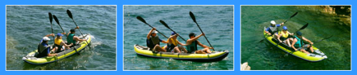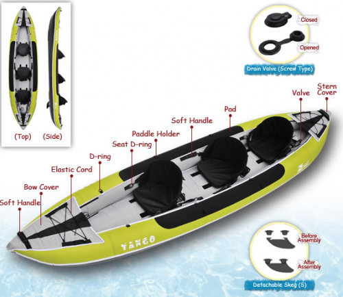 Family kayak: ideal for discovery outings on easy waters and seashore. Very roomy and comfortable.Same features and specifications as TANGO TA200, with added neoprene foam padding on top of side chambers for more comfort. ● V-shaped bottom floor: superb shape and lines Provides increased stability, even in rough waters.
