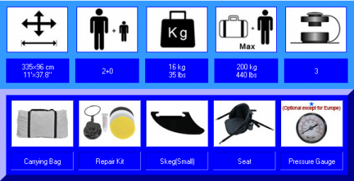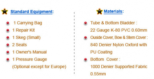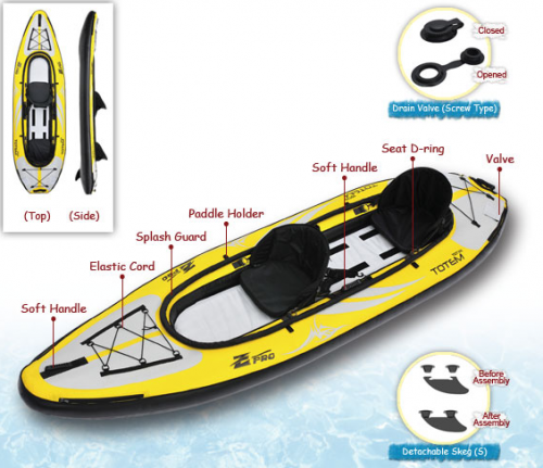 A new kayak shape, innovative hull design and great looks; enhanced performance and added features.Suitable for beginners as well as experienced paddlers.The extra flat, wide bottom provides unequaled connection to the water and hence amazing stability and maneuverability.It’s wide pro-portions give ample seating and leg space for 2 paddlers. Both front and rear spray covers are equipped with bungee cords to tie down additional gear. Designed and constructed to be used on rivers, lakes and at the sea shore. ● Floor cover + top hull of side chambers: made of extra strong 840 denier Nylon Oxford with polyurethane coating.