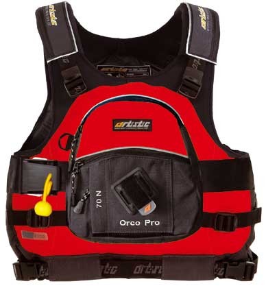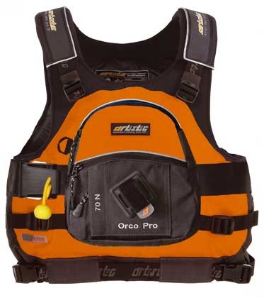 Heavy pull-over vest made of tough and long lasting materials with all the necessary safety features. Mine has so far done somewhere in between 300 and 500 days on the water (river and sea mixed) and still looks like fresh out of the shop. I had to change something, though: the D ring for the leash's carabiner is above the big buckle of the rescue belt. This way, there's a clicking noise at every move you make. I took that ring off and put it on the belt under the front pocket.