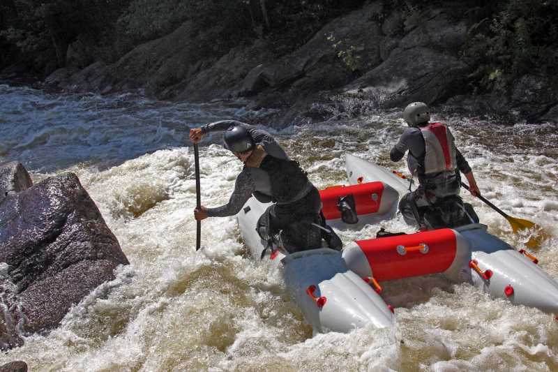 At Gauley Festival 2015 ZelGear LLC have introduced the new type of frameless cataraft R2 ( there is R4 model as well). It is unique new design indeed, with kneeling "saddle-type" seats mounted on top of flattened tubes. Seats allow for full range of technical strokes and braces that C1 and C2 boaters are accustomed too.